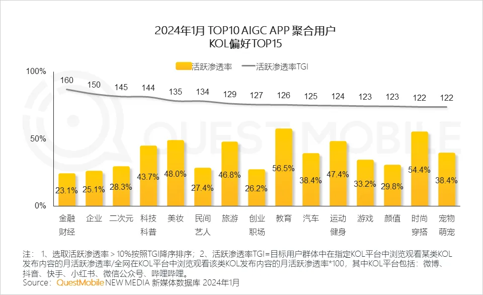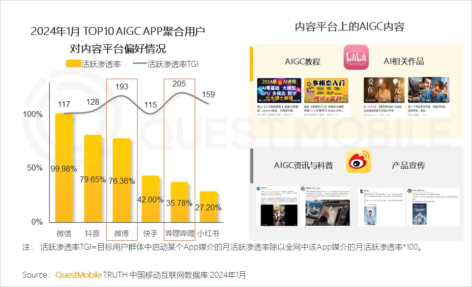 QuestMobile数据显示,2024年1月TOP10AIGC APP聚合用户对哔哩哔哩APP的活跃渗透率TGI达到205,对微博APP的活跃渗透率达到193。