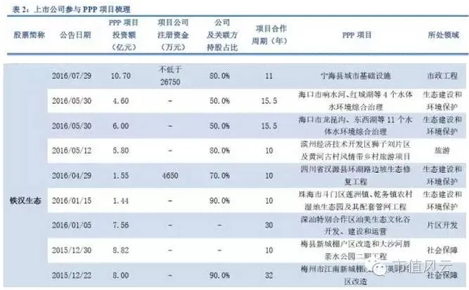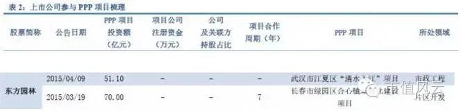 这是我从一篇题目为《上市公司参与PPP项目全梳理》文章里面截取的有关东方园林的信息,文章以正式签订合同公告日期为准,收集了从2014年6月到2016年9月8日(文科园林项目)时间段上市公司参与的PPP项目。