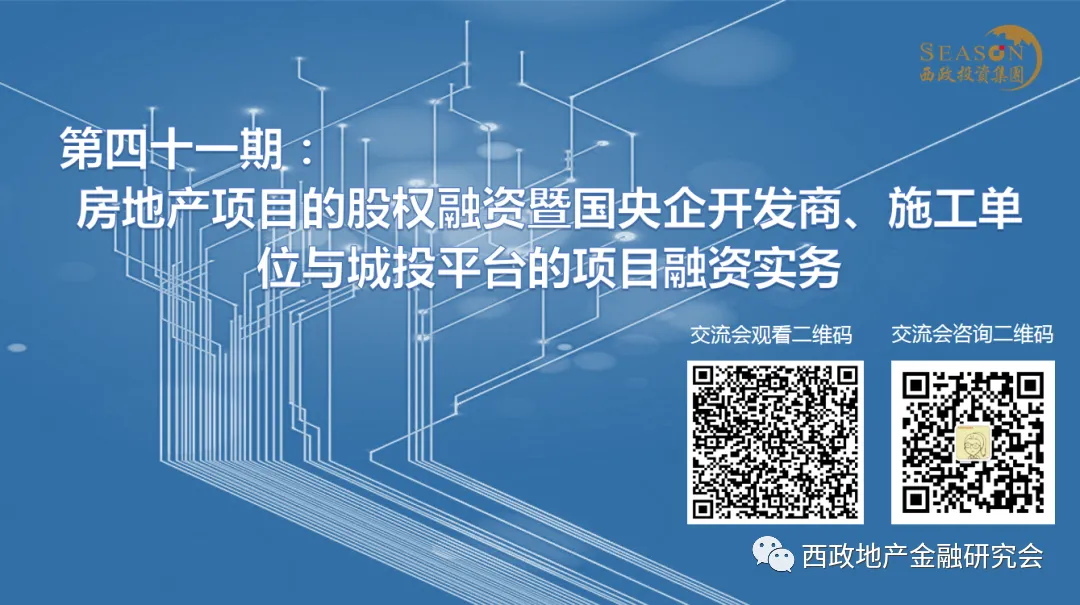 更多关于房地产项目的股权融资暨国央企开发商、施工单位与城投平台的项目融资实务,欢迎扫码听取以下交流会相关内容: