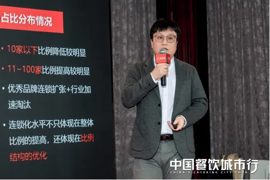 随着餐饮市场的竞争愈发激烈,抢顾客、抢流量、抢身位的各种“卡位战”轮番上演,连锁餐饮品牌在管理、运营、营销等方面的挑战也随之增多。2024年,连锁餐饮品牌要如何从竞争中突围?基于此行业背景,红餐网联合创始人、副总裁樊宁发表了《从大数据看中国餐饮发展趋势》的主题演讲,通过一组组数据总结近几年连锁餐饮的大趋势,助力餐饮企业寻找餐饮发展的新机遇。