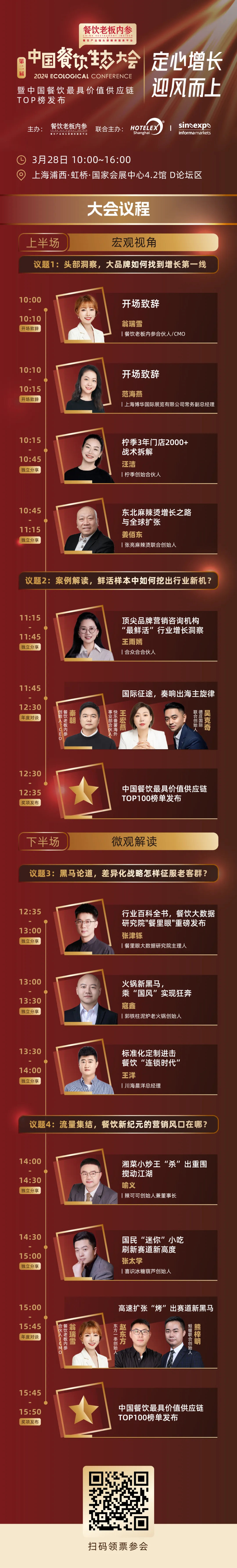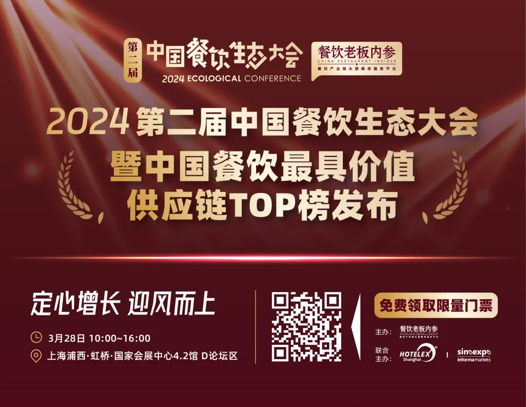 3月28日,“定心增长,迎风而上”2024第二届中国餐饮生态大会,也将在本届展会的分论坛中重磅登场,同时将现场发布中国餐饮最具价值供应链TOP100榜。