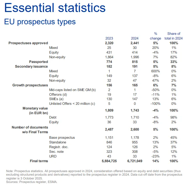 - 在上市法(Listing Act)下的新豁免文件框架中,2024 年 Annex IX 豁免文件报告极少:意大利 2 份、西班牙 3 份、瑞典 2 份,ESMA 计划自 2026 年起转向基于 ESAP 的机器可读统计体系。