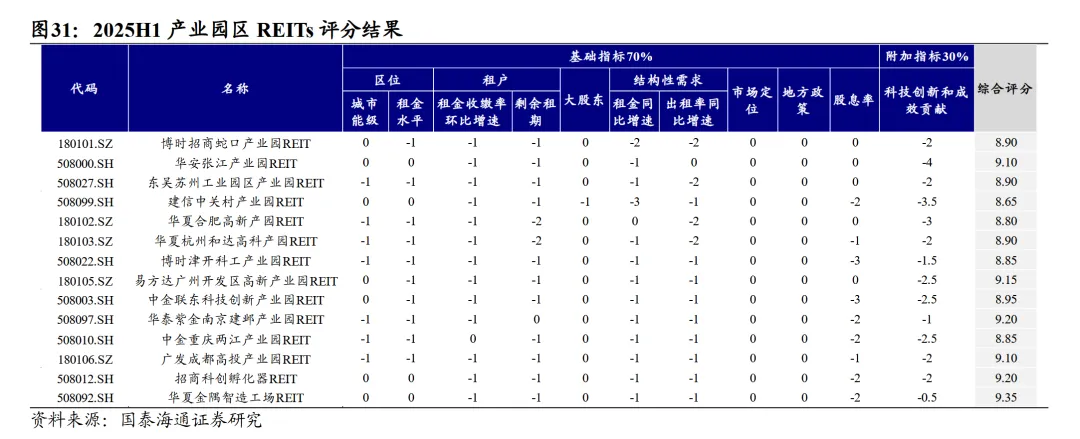 他们研究设计了评价产业园区REITs的基础指标和附加指标,最后给出了评价结果:
