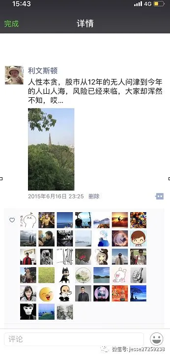 这里先上一张图,这是我在15年指数见顶下跌第二天写的微信朋友圈,原因是当时劝无数朋友卖股票,但是没什么人搭理我。
