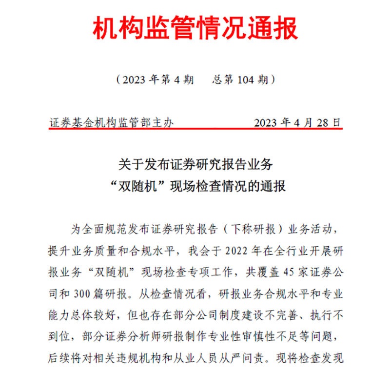 在《通报》中,监管部门指出,此次现场检查专项工作共覆盖45家券商和300篇研报,在检查中注意到三大典型问题。