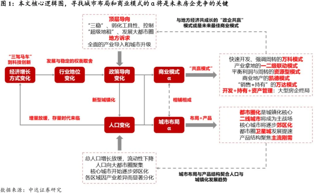 房企排名缘何涨落?核心是人口与政策两大需求层面变化。对行业需求的把握程度直接决定了房企的成败。从近年来后来居上者和守成落后者的发展路径来看,顺应人口和政策变化趋势的房企才能于激烈竞争中脱颖而出。都市圈化、卫星城化的人口城镇化趋势已较为清晰,而政策、顶层思路则是影响行业需求的另一重要维度。