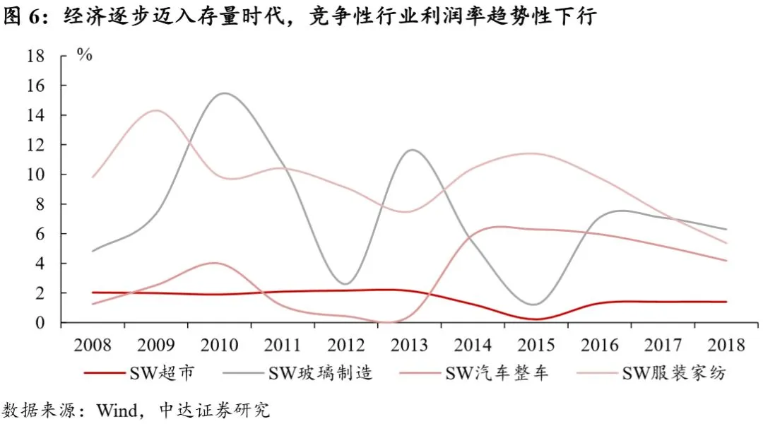 经济增长动能放缓,发展模式面临转型。由于经济增量的减少,各行各业的竞争逐步趋向零和博弈,即由原来的“分享蛋糕做大”变为现在的“互相分蛋糕”。由于整体生产率提升缓慢,各行业的市场规模增长也将放缓,如社会销售品零售总额和商品房销售额增速均持续下滑。与之对应的,竞争性领域的盈利空间也在缩窄,典型的如超市、玻璃制造、汽车整车、纺织家纺等子行业销售净利率近年来出现趋势性下滑。总体而言,存量博弈使得投资机会与利润空间均受到影响,经济增长模式面临转型;聚焦优势主业、通过商业模式构建护城河将是企业未来长期发展的关键。