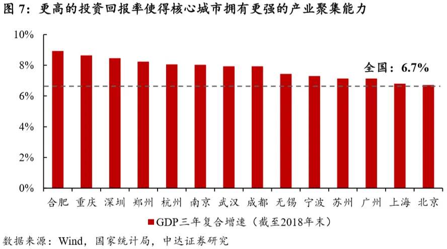 资本追逐更高报酬率使得产业向核心城市聚集。由于经济增速放缓,核心城市在基础设施、营商环境、产业结构等方面的优势将更趋明显,资本为追逐更高回报率将使得产业进一步向核心城市聚集,这也是存量经济时代的特征之一。可以看到,一线城市及热点二线城市近三年GDP复合增速普遍高于全国平均水平,部分承接了沿海优势产业的二线城市入合肥等增速远高于全国及部分一线城市的水平。