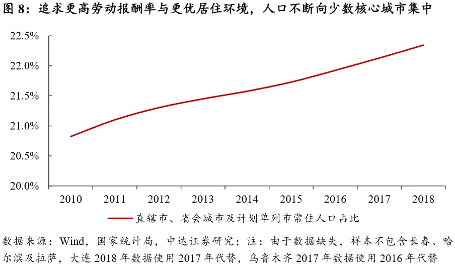 产业的聚集将直接导致人口和区域的分化,都市圈化成为发展重点。居民通过劳动获取收入,人口会流向产业经济更为发达的城市以获取更高的劳动报酬率。从2010年至今,直辖市、省会城市及计划单列市(因数据缺失不包含长春、哈尔滨和拉萨)常住人口占总人口比例持续提升,近八年提升了约1.52个百分点。资本和劳动都是重要的生产要素。更好的产业发展吸引更多人口流入,更多的人口流入使得区域产业经济发展更好,这种正向反馈使得地区间发展水平乃至房地产市场均出现明显的分化,大都市圈的发展将远好于其他区域,马太效应愈加显著。