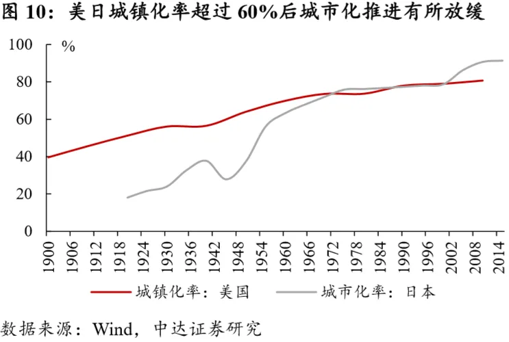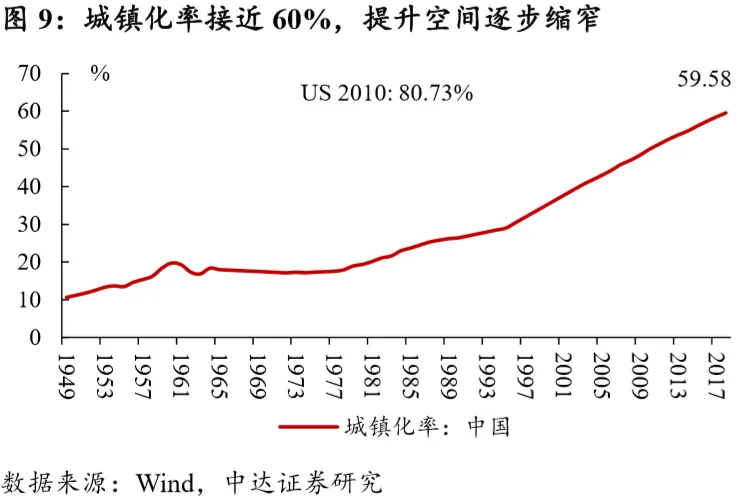 城镇化空间仍在,但快速增长阶段或已结束。截至2018年末,我国城镇化率为59.58%,增长速度继续放缓。对比海外,美国2010年城镇化率超过80%,而日本2015年超过90%;与美国和日本相比,我国城镇化率仍有提升空间。但另一方面,从发达国家经验来看,城镇化率超过60%后增速将明显放缓(日本2000年后城镇化加速系老龄化和少子化导致人口减少,许多农村被废弃,出现被动城镇化)。整体而言,房地产市场仍有发展空间,但短期快速增长的动力可能并不充足。