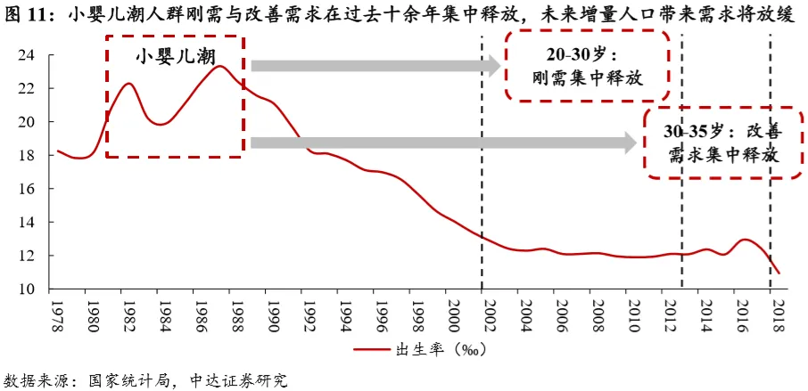 小婴儿潮人群刚需与改善需求在过去十余年集中释放,未来增量人口带来需求将放缓。人口是房地产中长期需求核心。1982年与1987年是我国上一轮出生人口高峰(对应上世纪60年代的大婴儿潮)。这部分人群进入20岁-35岁年龄区间后刚性需求和改善性需求集中释放,推动了过去十余年的地产牛市。另一方面,2014年至2016年出台的鼓励改善性住房消费政策也使得潜在改善需求借助金融杠杆集中释放。客观而言,人口结构的调整需要较长时间。随着小婴儿潮人群逐步迈入生命周期中的稳定阶段,未来增量人口带来的需求释放将会逐步放缓。