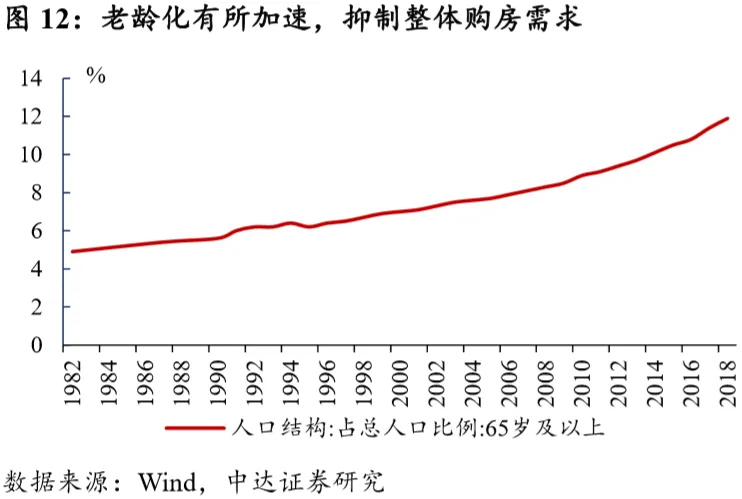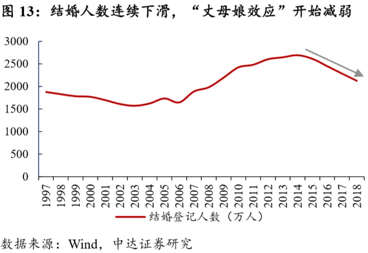 老龄化有所加速,结婚人数连续下滑影响购房需求。过去长期执行的独生子女政策等因素使得我国人口年龄结构逐步趋于老龄化,总人口中65岁以上老年人口占比近年来持续提升,2015年后出现一定加速。另一方面,我国登记结婚人数自2014年见顶后逐年回落,“丈母娘效应”(婚房需求)开始减弱。上述因素将对房地产行业中长期需求产生一定的影响。