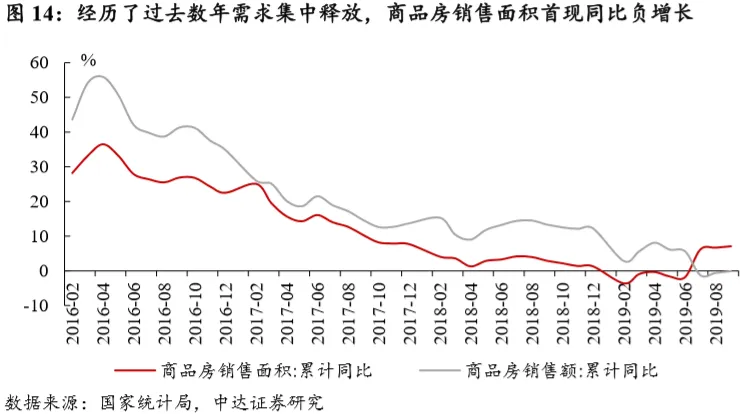需求集中释放后,商品房市场销量近年来首现下滑。2019年1-9月,全国商品房销售额累计同比增长约7.1%,销售面积累计同比下降0.1%;商品房销售面积自2019年2月开始负增长,为2015年6月后首次。经历了过去数年的需求集中释放后,商品房市场销量整体增速放缓,行业进入高位平台期。在此阶段,房企发展需更加差异化。