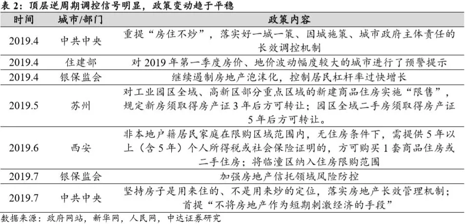政策对楼市把控力度逐步加强,市场预计进入高位平台期。房地产市场长期看人口、短期看政策已是普遍接受的事实。上一节讨论的多为中长期影响因素。从短期内外部环境来看,居民收入提升、地方政府土地财政模式未变都将支撑楼市需求;但另一方面,贸易战背景下打压超级地租、居民杠杆率上升过快、经济对房地产依赖度边际下降等都将对房地产市场形成压制。值得注意的是,当前政府任期更长,政策更具一致性,主要经济官僚对于货币宽松、刺激房地产有着一定抵触,更加重视科技创新;这些是与之前最大的区别。我们也看到,当今年3、4月份出现小阳春、土拍热度快速上升之际,中央重提“房住不炒”,热点城市苏州、西安等再度加码调控,融资渠道也再度收紧;而去年四季度楼市与经济前景不明朗时,部分地方政府对政策进行微调,小幅放宽楼市调控,政策并非像过去那样单向。基于此,我们认为房地产市场整体进入高位平台期,短期政策大幅变动的可能性不大,市场波动将趋缓。