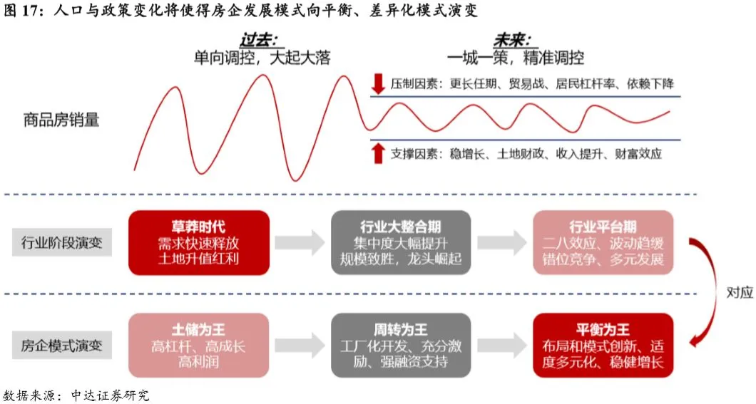 行业逐步进入平台期,平衡增长模式胜过赌周期。1998年房改后,居民商品房需求集中释放,叠加分税制改革后土地财政重要性增加,土地价值快速上升;在此阶段,房企增长模式为“土储为王”,利用高杠杆获取土地,通过土地快速升值红利实现高成长、高利润。随着行业日趋成熟,规模效应开始显现,龙头房企通过工厂化开发、充分激励以及强融资配合快速抢占市场份额,“周转为王”成为行业大整合期的主流模式。随着行业逐步进入平台期,房地产市场的波动料将趋缓,结构性行情料将成为主导;与之对应,“平衡为王”的增长模式将更加适合未来的市场情况,龙头房企通过聚焦开发主业、适度多元化以获得稳健增长,中型房企通过错位竞争、创新商业模式获得规模增长。赌周期的发展模式的风险在加大。