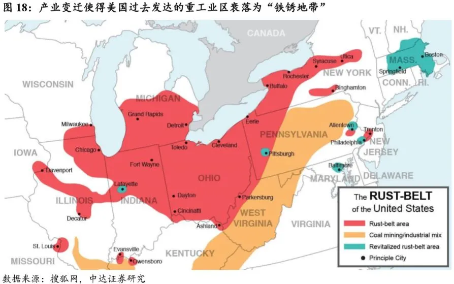 小结:企业发展更加强调聚焦与特色,城市投资逻辑由面到点。经济增长模式转型背景下,房地产行业特殊性或逐渐弱化。房企在发展过程中更应聚焦具有竞争优势和经验的主业,并通过战略和商业模式优势实现卡位。另一方面,尽管整体经济增长放缓,但城市间的分化发展远未结束,如在19世纪后期到20世纪初期,美国中西部因为水运便利、矿产丰富,因此成为了重工业中心,钢铁、玻璃、化工、伐木、采矿、铁路等行业纷纷兴起,匹兹堡、密尔沃基、克利夫兰等工业城市也一度相当发达。然而当美国步入第三产业为主导的经济体系之后,这些地区的重工业纷纷衰败。很多工厂被废弃,而工厂里的机器渐渐布满了铁锈,因此那里被称为了铁锈地带;目前以新兴产业为主导的洛杉矶、旧金山等城市成为了美国人口和经济最发达的城市。对应到城市投资,过去“炒地图”逻辑可能不再适用,未来更多的将是以“点”为单位的结构性行情。