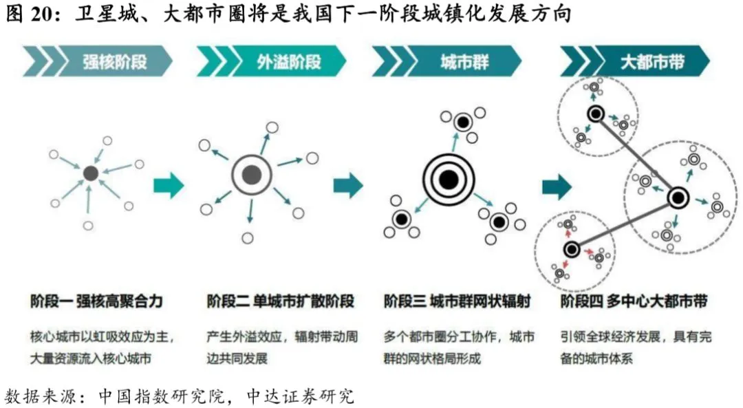 卫星城是大城市发展的必然产物,一线城市卫星城得到初步发展。从海外经验来看,城市发展通常将会经历“城市—都市圈—城市群”的过程。在发展早期,大城市集中了大部分资源,城市发展以虹吸效应为主。而当核心城市资源及人口承载力趋于饱和后,人口与产业开始向周边城镇迁移,核心城市开始城市更新的过程(如城市功能区调整、旧城改造等),产业形态向坪效更高的服务业升级;当前我国中心城市处于此发展阶段。随着外溢效应的扩散,核心城市与周边区县联系更为紧密(郊区化),都市圈、卫星城逐步形成;我国一线城市目前处于郊区化的初级阶段。城市化进程较快的一线城市由于中心区已较为饱和,周边卫星城将逐步发展,而二线城市发展仍集中在中心城区。