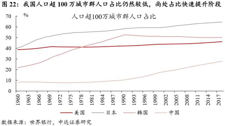 核心二线与一线卫星城处人口快速聚前期,投资价值日益凸显。如前所述,我国城市化处于人口由中小城市向大城市聚集的第二阶段,而一线城市周边卫星城将逐步得到发展。相较可比发达国家,我国人口超100万城市群人口占比仍然较低,尚处在占比快速提升阶段(对应上世纪60年代末韩国状态)。作为人口众多而发展空间有限的国家,我国2018年人口超100万城市群人口占比仅约27.89%,而发展模式等相似的日本和韩国该比例在达到50%之前均快速提升。大城市的公共资源配置与经济发展条件与远好于中小城市;随着发改委逐步放开放宽大城市落户门槛,人口将持续向核心二线城市及一线城市周边卫星城聚集,上述城市投资价值日益凸显。