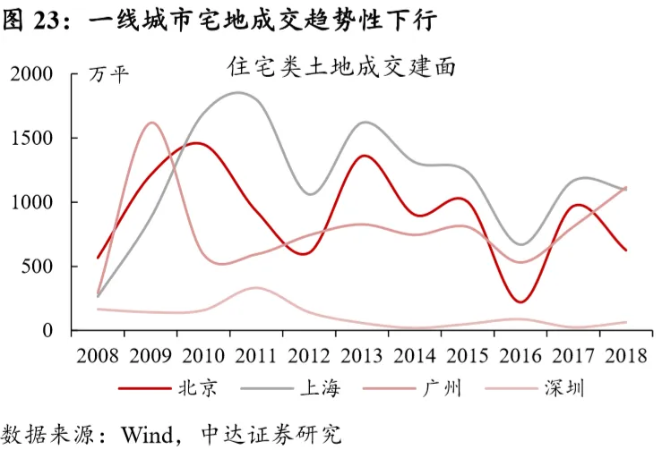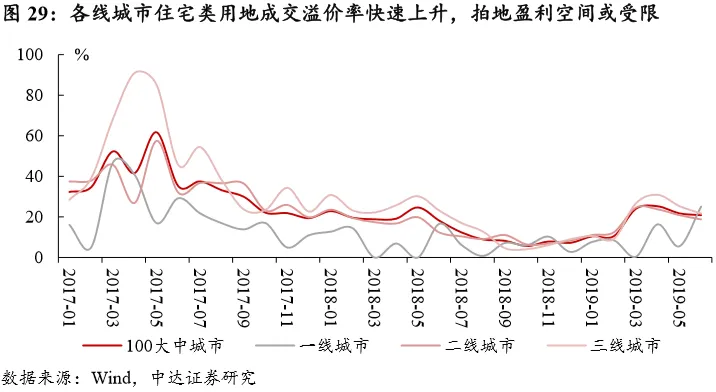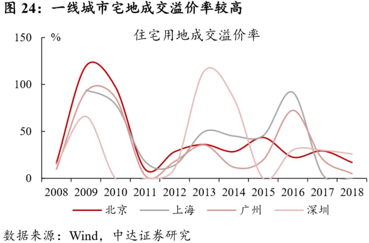 产业转移、市场供需等因素使得房地产行业成长性向二线及一线卫星城转移。从宏观角度看,二线核心城市与一线卫星城的加速发展符合产业转移的需要(如富士康),符合人口流动方向与国家新型城镇化政策导向。从需求层面来看,一线城市中占较大比例的投资性需求将长期受到打压。从城市发展空间来看,一线城市开发早、成熟度高,土地资源瓶颈日益凸显,城市扩张速度逐年放缓,2004年以来建成区增速已开始慢于二线。从土地供应上看,一线城市普遍面临供地瓶颈,土地市场竞争激烈,门槛日益提高;以深圳2019年6月土拍为例,总保证金高达约1100亿元,5宗地块最后均以最高限价被斩获,全场举牌达343次,出让总金额达224亿,参与房企均为龙头房企或大型央企。近两年由于土拍限价,一线城市宅地成交溢价率回落,但由于出让条件中多附带配建、公建等,实际溢价率仍然较高。行业成长性将向二线及一线卫星城转移。
