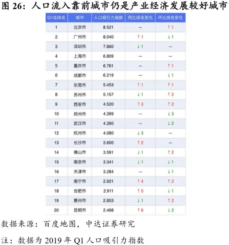 都市圈并非铁板一块,投资仍需精选城市。目前国内公开报道中提及的都市圈多达十余个,但并非所有都市圈均具备投资价值;并且,同一都市圈内各城市分化也较为明显,这一点从上半年销量情况与近年来人口流入情况均可看出。从经济圈人口流入情况来看,长三角、珠三角、中部的武汉、郑州及长沙、西南的成都和重庆人口流入居前。而京津冀都市圈中除北京外整体表现不佳;华北、西北以及东北人口吸引力较低。楼市看人口,人口看产业,在落户门槛放松的大背景下,人口继续向南方核心城市集中预计是大势所趋。