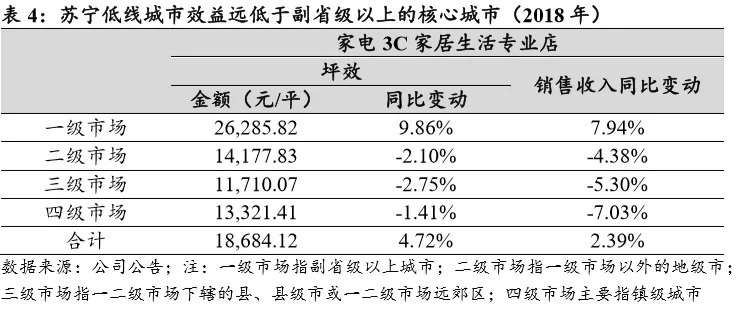 非都市圈低线城市产业与人口孱弱,房企布局谨慎采取过度下沉模式。如前所述,核心城市聚集人口与产业的马太效应日趋明显,三四线城市楼市也出现了明显的分化。从美国经验来看,产业变迁带来的人口和财富分化将使得不同区域房价出现较大分化,以新兴产业为主导的城市房价涨幅远超以传统产业为主导的城市。另外,经历了过去数年的大力推进后,2019年棚改新开工计划已降至285万套;近期,中央政府也开始对地方政府隐性债务进行集中清理与规范,棚改的拉动作用或将弱化。一个现象是,从苏宁线下门店坪效与销售收入变动来看,一级市场(副省级及以上城市)效益远好于其他低线城市,侧面印证了低线城市人口与需求不振的事实;过度下沉可能并非发展良方。