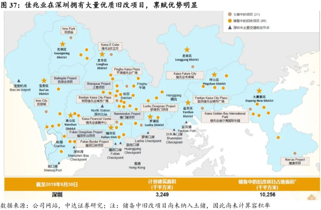 禀赋亦是房企取得独特竞争优势的方式之一,招商蛇口、佳兆业及绿景中国等为此类房企代表。资源型房企通常拥有某些特殊位置的土地资源。随着土地价值不断提升,公司特殊禀赋的稀缺性也日益凸显。例如,作为蛇口片区的主要建设者及运营者,招商蛇口拥有深圳蛇口、前海片区大量土地资源,公司拥有的大体量核心区资源是难以复制的竞争优势;华侨城也与之类似。资源型的另一种表现形式为旧改储备。例如,至2019年中期,佳兆业集团占地面积约3200万平方米旧改项目尚未纳入土储(未计容积率),项目全部位于大湾区内,深圳市占比达31.9%,潜在转化货值体量较大。又如,绿景中国地产控股股东拥有土地储备1210万平,项目均位于粤港澳大湾区核心城市的核心地段,其中尤以深圳白石洲旧改项目最为突出;该项目位于深圳南山区核心位置,总计计容开发规模达358万平方米,潜在开发价值巨大。除佳兆业与绿景中国外,龙光地产、合景泰富集团、时代中国控股也在大湾区内拥有丰富的旧改储备资源。旧改也是民企获得核心资源的重要手段之一。