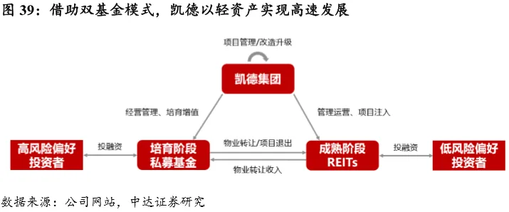 “双基金”模式驱动公司轻资产模式高速发展。公司的私募基金+REITs的“双基金”模式业内闻名。根据底层物业资产的风险收益属性与投资者偏好,凯德将投资物业分为培育期物业和成熟期物业,培育期的物业具有比开发物业更高的风险,相应资本升值的潜在回报空间也更大,更适合私募基金投资者的要求;而成熟期的物业收益率相对稳定,且具备稳定分红的特性,适合REITs投资者的风险收益偏好。公司培育期项目通常由私募基金培育孵化,经旗下专业的商管团队管理、运营后,项目逐步成熟,回报率趋于稳定;待物业资产增值后,公司会在适当时机将项目注入REITs实现退出。借助于强大的投资物业管理运营能力以及“双基金”模式,公司成功打通了“募投管退”全周期环节,以轻资产模式驱动公司高速发展。