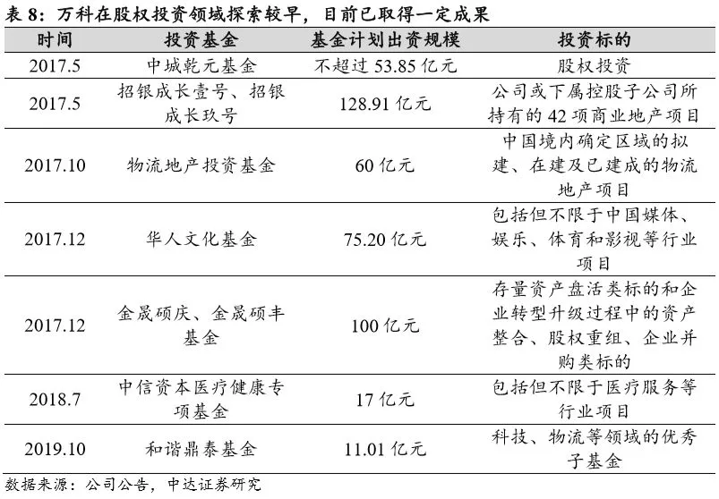 万科在资产管理领域探索较早、理念领先,竞争优势较为突出。从目前情况看,万科是国内开发商中向资产管理行业进军较早的超大型房企,及早在境外搭建了资本市场平台,2018年更是完成了普洛斯的私有化交易,成为普洛斯最大权益拥有者。公司近年来也参投了华人文化基金、中信资本医疗健康专项基金等私募股权基金,股权投资经验逐步增加,同时公司的企业文化与人才储备也能够支撑公司资产管理平台的发展。普洛斯近期参与了招商局资本的混合所有制改革,万科未来或通过成熟的境内外资本市场平台加大股权投资力度。我们认为,万科是最有机会在资产管理领域取得成功的超大型房企之一。