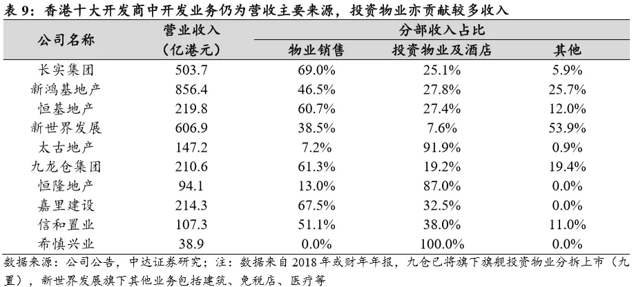 开发业务增长空间受限背景下,持有投资物业成为稳定收入与现金流的重要来源。必须承认,房地产行业的天花板似乎已经触手可及,全国范围内销售面积已开始负增长。为维持现有资产规模,并在长期获取稳定的收入与现金流,增加投资性物业的持有成为房企的可行选择之一。另一方面,商业地产也能与住宅开发主业形成一定协同效应。香港开发商在上世纪70、80年代开发业务见顶后普遍选择了向“住宅销售+投资物业持有”模式转型。目前,香港主流发展商如长实集团、新鸿基等投资物业收入占比通常在20%-40%左右,为公司重要的收入来源之一。目前内地主流开发商投资物业租金收入占比通常在10%之下。“住宅销售+商业持有”模式也许是未来缩量时代房企商业模式的最终选择。