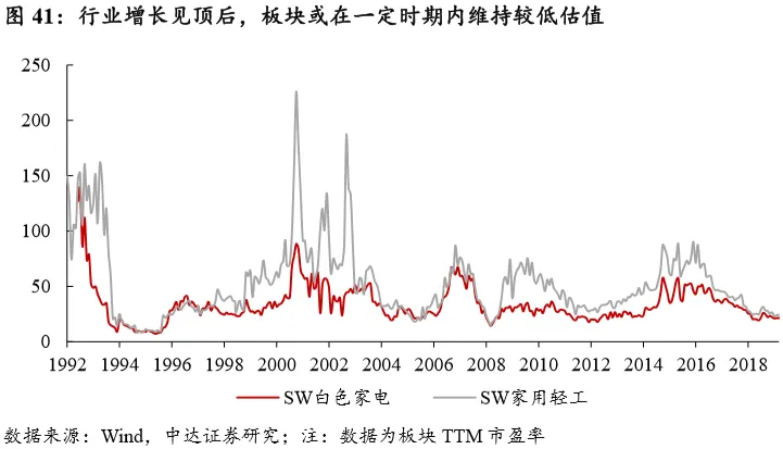 行业总量空间收窄后,板块或在一定时期内维持较低估值。公司金融理论表明,公司股票市盈率与公司利润(股利)的增速成正比;公司业绩增长越快通常市盈率会越高,反之当业绩增速下降时,市盈率也会趋于降低。举例而言,白色家电、家用轻工等行业过去估值水平较高,但随着行业空间触顶,板块的估值水平也逐级下降;政策等事件性驱动能够在短期推动估值快速上行,但长期看板块估值中枢呈明显下降趋势。地产行业同样如此;由于总量空间收窄,地产板块小周期估值上升峰值或难以超过前期高点,估值中枢也将趋势性下降。对周期行业而言,简单使用估值分位来判断股价走势可能并不合理。