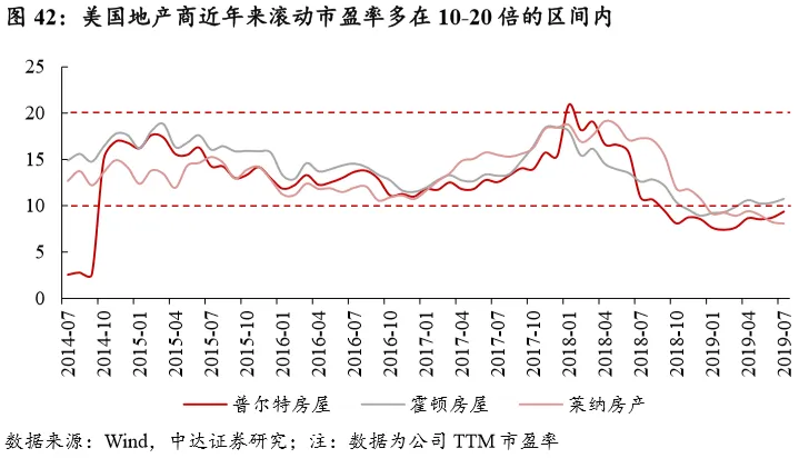 简单对比国内外估值水平或存一定问题。近年来,美国主要地产商滚动市盈率通常维持在10-20倍区间内,明显高于内港中资房地产公司估值;不少投资者据此认为房地产板块估值有较大提升空间。但事实上,国内外估值的差异更多是反映行业发展阶段的差异。例如,假设当前内地房地产公司估值为5倍,海外成熟公司为10倍,二者存明显差距。但由于内地房地产市场规模长期呈下降趋势,未来业绩或难维持当前水平;假设到稳定期,市场规模缩减一半,则其他条件不变情况下内地公司估值也将达到10倍。事实上,当前的低估值隐含了投资者对行业空间的考量,简单对比国内外估值水平也许并不合适。
