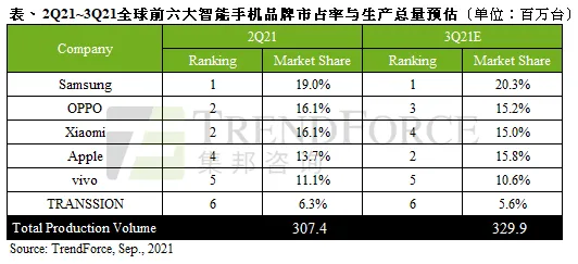 TrendForce集邦咨询在最近发布的报告中,展示了2021年第二季度智能手机市场的相关情况。