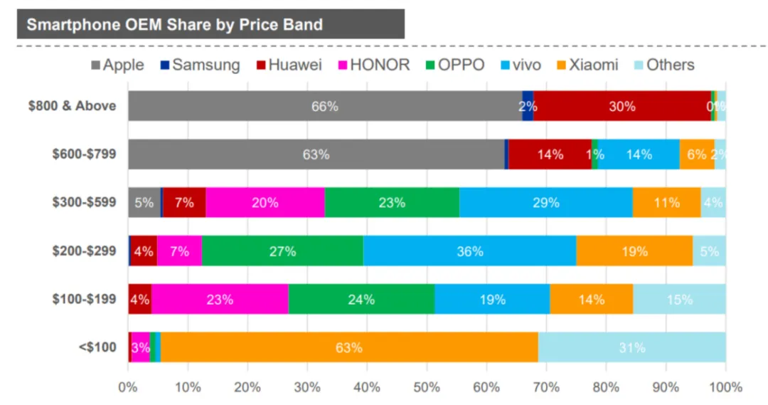 同时,在这份排名的最高档位也是普遍认为的高端价位段中,苹果占据了66%的份额高居榜首,华为则占据了30%的市场份额,位列第二。