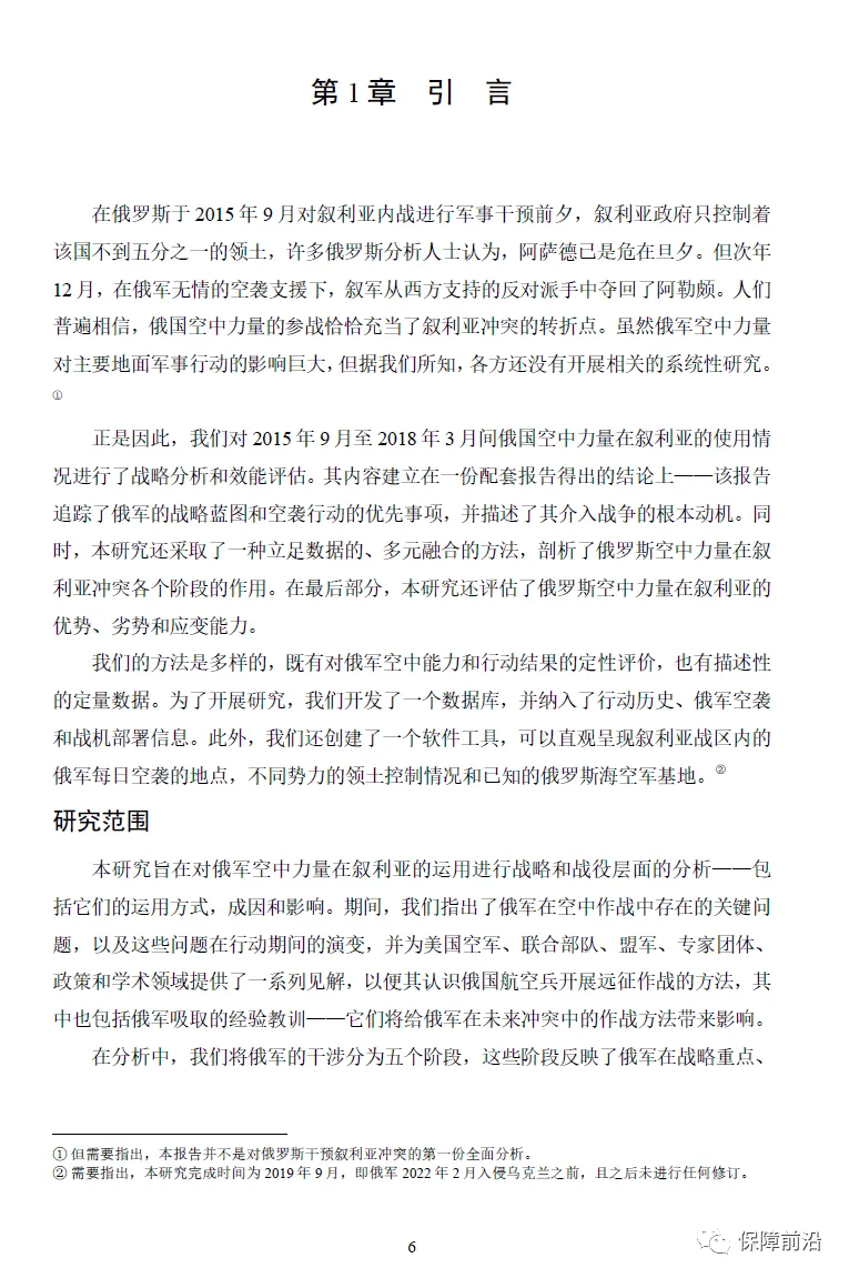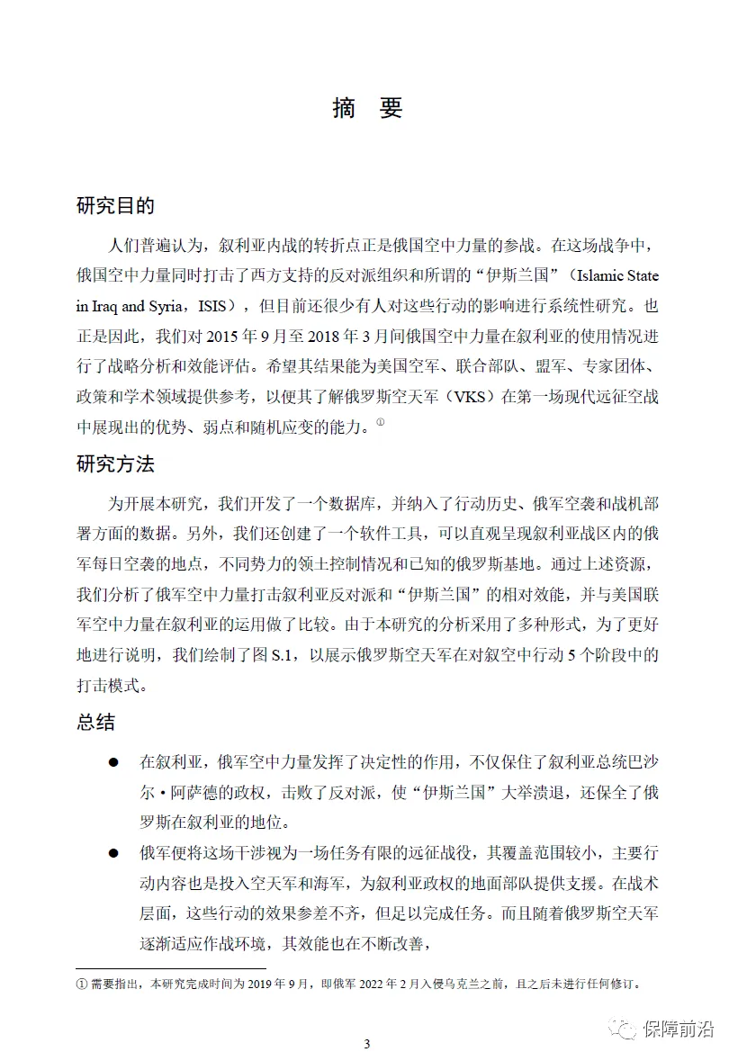 众所周知,叙利亚内战的转折点是俄国空中力量的参战。在该场战争中,俄国空中力量同时打击了西方支持的反对派组织和所谓的“伊斯兰国”(Islamic State in Iraq and Syria,ISIS)。为系统分析叙利亚内战中俄空中力量产生的影响,兰德公司对2015年9月至2018年3月间俄国空中力量在叙利亚的部署情况进行了战略分析和效能评估。2022年5月11日,根据研究结果发布了名为《大马士革之路:俄罗斯在叙利亚的空中作战行动,2015至2018年》的报告,该报告回顾了俄罗斯在叙利亚空中作战的历程、战略和战役行动方案,俄罗斯空天军的基地设置战略和部署情况、俄军空中作战行动的效能,以及对叙利亚之后未来作战的影响。