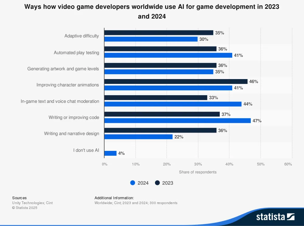 相比之下,剧情撰写与叙事设计等更依赖创意表达的环节中,AI工具的使用反而出现下滑,说明生成式AI在辅助创造性工作时仍面临局限。与此同时,AI在游戏测试与第三方服务领域的应用也有所增加——包括像Keywords Studios这样的供应商,已开始提供AI驱动的游戏测试与内容优化服务。