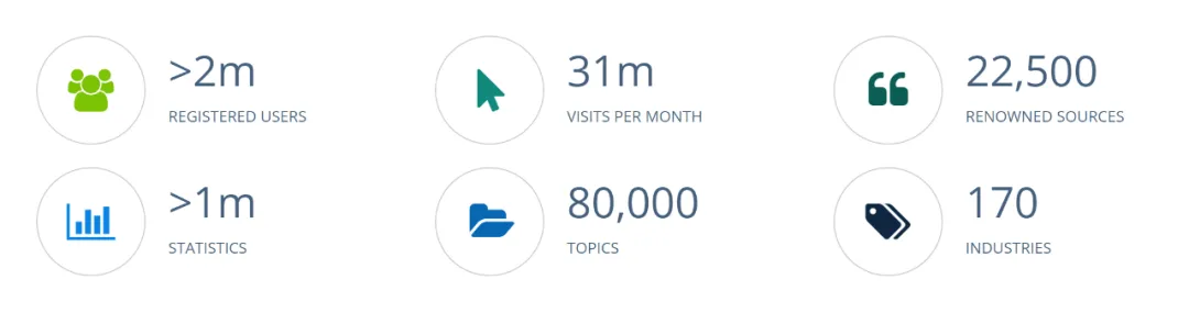 Statista是全球领先的综合商业数据平台,总部位于德国汉堡。平台汇聚了近200万精炼的统计数据,覆盖152个国家和地区,涵盖超过170个行业领域。数据来源广泛,来自22,500多个不同的数据源,涵盖多种形式,如统计数据、图表、市场研究报告、行业趋势预测、电商数据库及消费者调查等。Statista的内容涉及多个行业,包括通讯、消费品、工业、汽车、金融、媒体、贸易和社会等,致力于为企业用户和学术研究提供深度数据支持和精准分析。