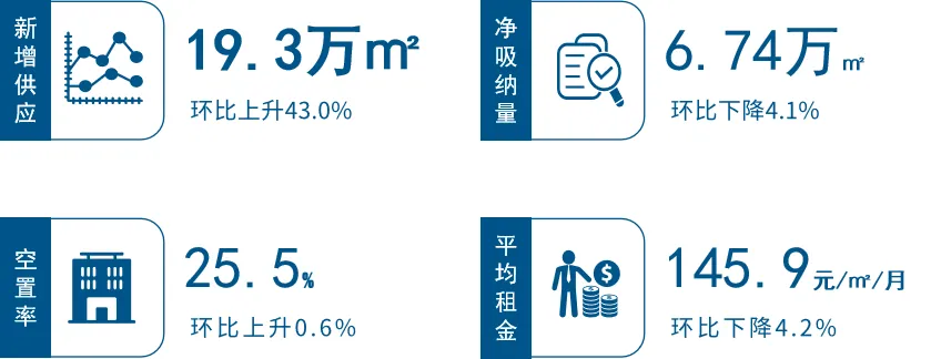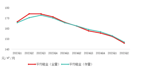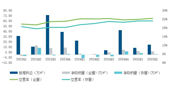 租赁市场:2025年Q2平均空置率25.5%,环比上升0.6%,净吸纳量6.74万㎡;平均租金145.9元/㎡/月,环比下降4.2%。