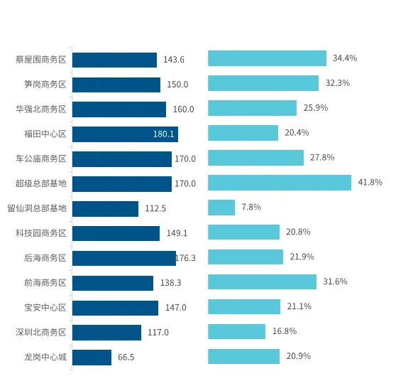 图:2025年Q1深圳核心商务区甲级写字楼空置率及租金