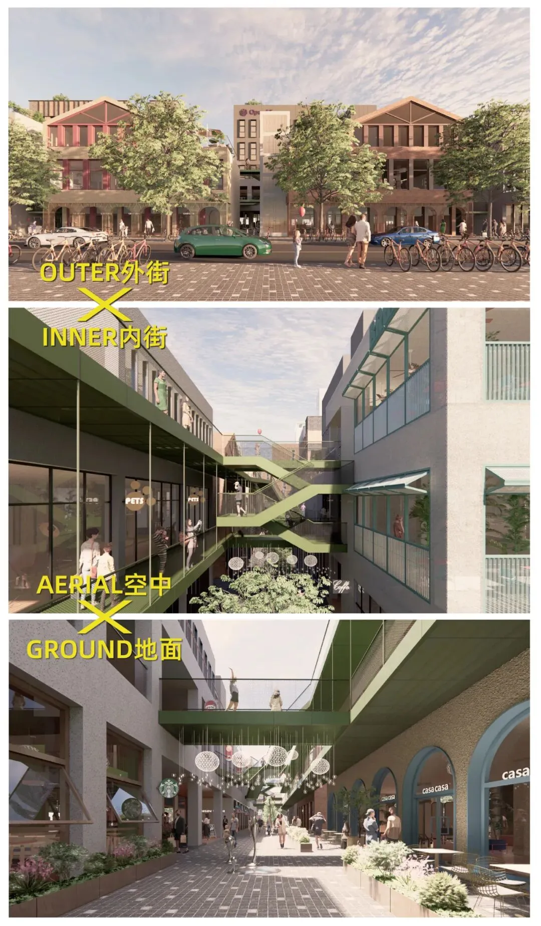 ▲外街与内街的咬合、空中与地面的衔接,中建万科·理想之地学术创作图,上海●业态如何丰富:从「机械式集合」到「沉浸式流淌」