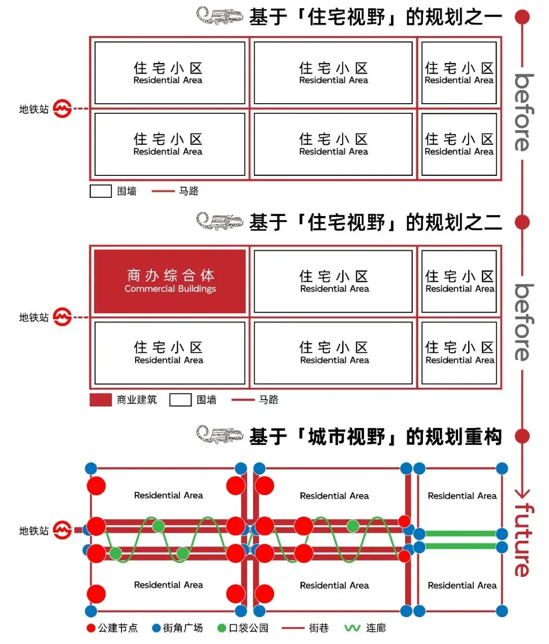 我们可以画三张示意图,来对比一下它们的根本性不同。第一张示意图是纯住宅小区(围墙围出了六个「孤岛」);第二张是城市综合体(把商办集中到一块地上,剩下的五块地仍然是五个「孤岛」);第三张是「未来城市理想单元」,你可以感受到什么叫「与城市深度交融」——