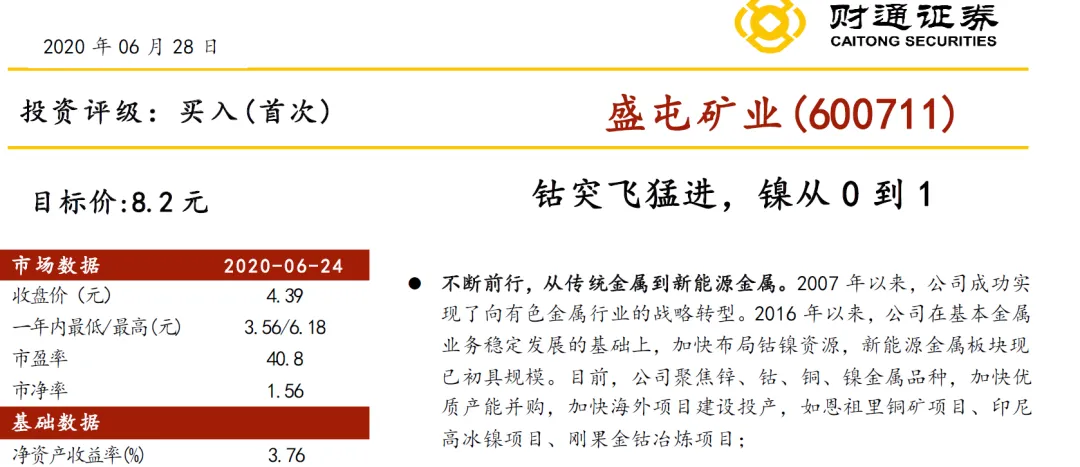 财联社梳理发现,6月28日,财通证券分析师李帅华发布研报指出,盛屯矿业钴板块受益产能提升,业绩进入快速增长期,镍板块即将投产,实现从0到1的突破,预计未来三年公司业绩复合增速达到50%以上,首次覆盖给予12个月目标价8.24元,较当前股价4.6元尚有近80%上行空间。