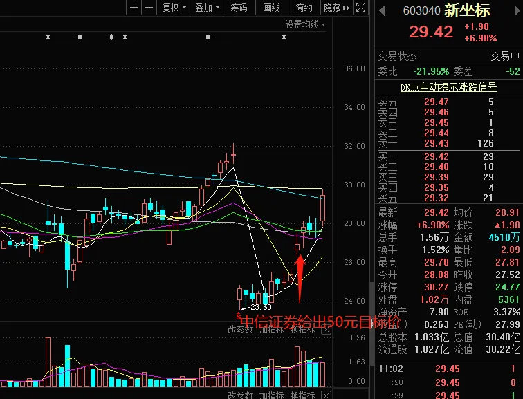近期备受关注的另一个标的新坐标,中信证券在6月22日发布相关研报,分析师陈俊斌指出,公司为国内冷锻件细分领域龙头企业,毛利率维持在60%+,为A股零部件第一。目前,新坐标在全球市场上的份额仍然处于低位,凭借其过硬的质量和低成本优势,发展空间广阔。此外,公司新产品已经顺利打入海外市场,海外市场有望迅速发展,中信证券预计,到2023 年,新坐标海外营收将达到40%,成为公司重要的盈利来源。陈俊斌预测,新坐标合理估值为2021年25倍PE,目标价50元。研报发布当日新坐标收盘价为26.86元,涨幅空间超80%。此后几个交易日新坐标涨幅亦接近10%。