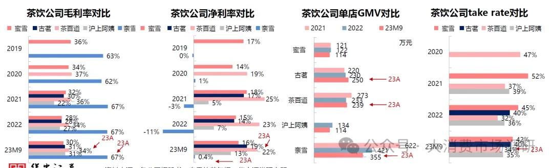 毛/净利率:蜜雪冰城/古茗毛利率相当,差异在销售投入影响净利率;茶百道净利率高于同业,因毛利率偏高;沪上阿姨净利率低于同业,规模效应尚待加强;直营模式的奈雪毛利率较高但净利率偏弱。单店GMV:蜜雪冰城/古茗健康,蜜雪门店加密下单店产出并未降低,古茗21-23年同店增速甚至连续增长12%/3%/9%Take rate:蜜雪冰城/古茗较高,体现其供应链价值;茶百道较低,或因原料定价且外卖占比更高(公司60%vs行业56%)