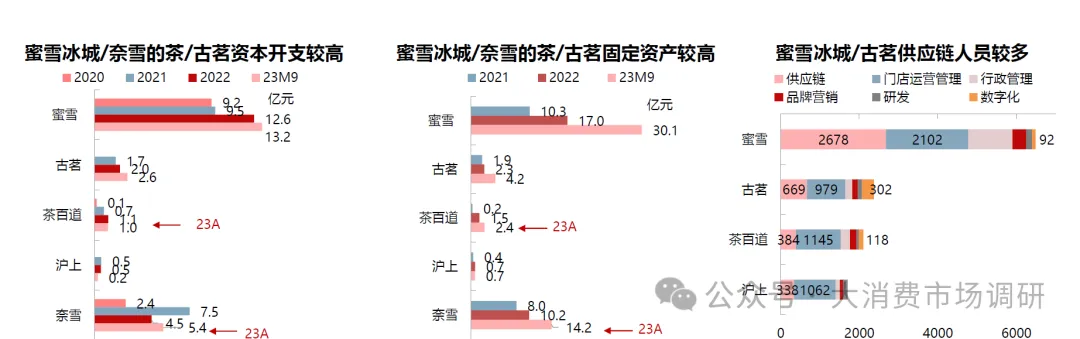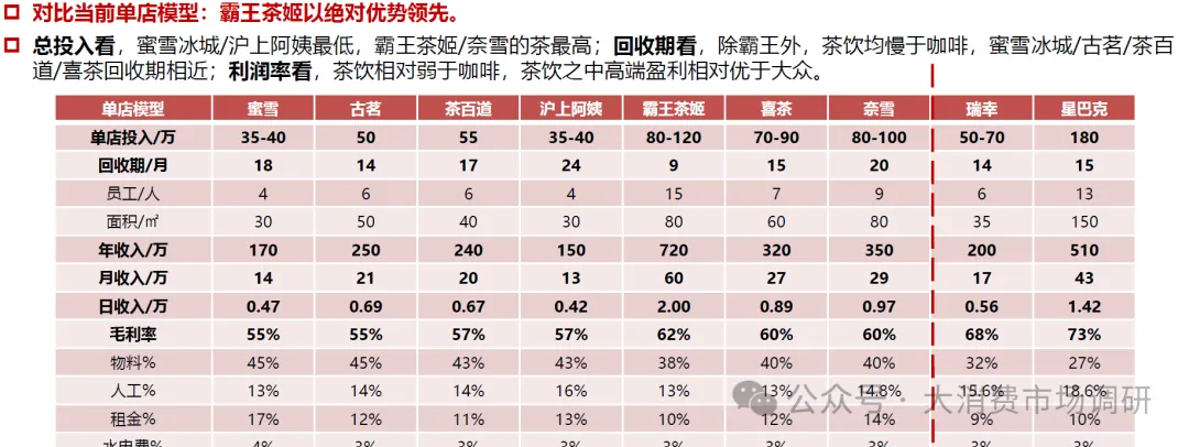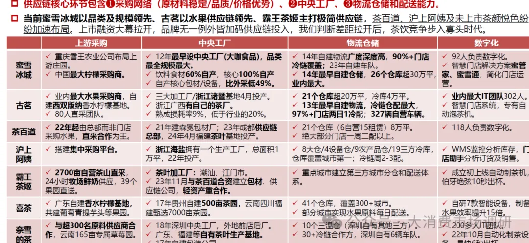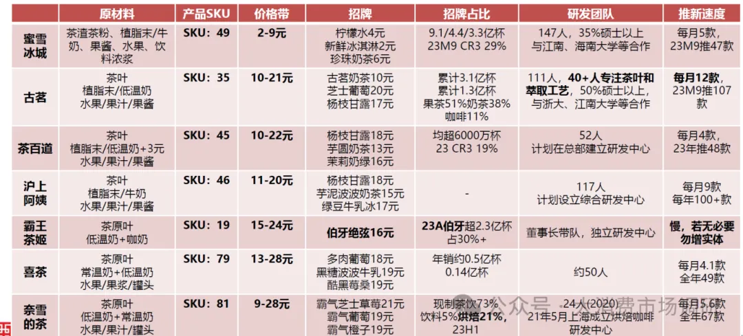 蜜雪冰城:薄利多销不难喝是王道,茶渣茶沫+植脂末+果酱等原料,但储运方便供应链相对简单。古茗:主打水果茶,曾为喜茶平替,推新快,研发投入最高茶百道:主打水果茶,研发费率最低。沪上阿姨:主打水果茶,子品牌茶瀑布对标蜜雪