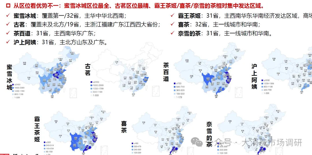平价:蜜雪冰城独占主导。定价2-8元的蜜雪冰城是平价市场的绝对主导,其GMV份额20%/量份额50%,几乎无同等竞争对手,在现制饮品领域其GMV已超中国咖啡GMV第一的瑞幸、全球仅次于星巴克。大众:充分竞争百家争鸣。当前百亿级别的古茗、茶百道、霸王茶姬占位领先,竞争已趋白热化。当前高价品牌奈雪的茶、喜茶纷纷降价进入大众市场(最低10元)并开放加盟,梯队竞争日趋激烈。高价:底部崛起倒逼降级。