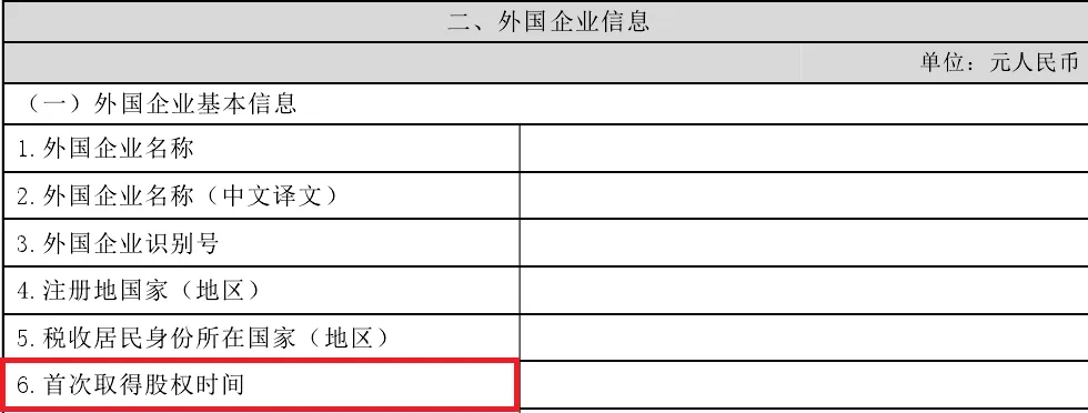 填写报告人首次取得境外被投资企业股权年度。