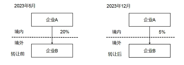 居民企业A在2023年5月取得外国企业B股份为20%,并于2023年8月转让15%的股份,2023年末持有外国企业B股份为5%,居民企业A在2023年度持有外国企业B的股份超过10%,符合本公告规定条件,居民企业A应就外国企业B填报《报告表》,其中第10栏“报告人持股比例(年末数)”“直接持股”应填写5%。