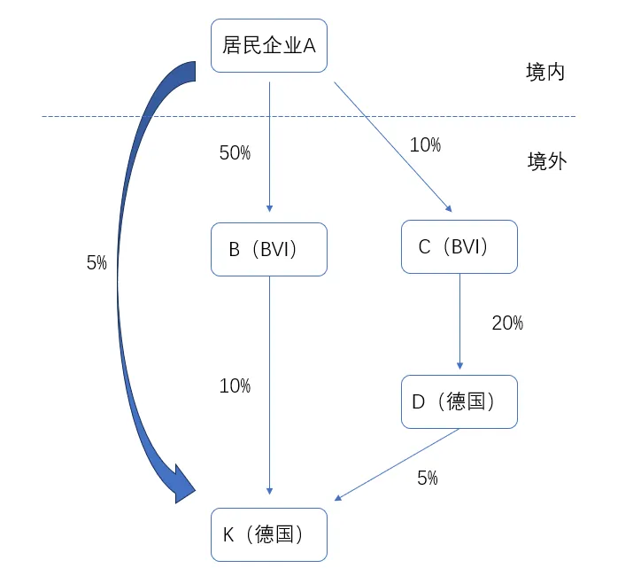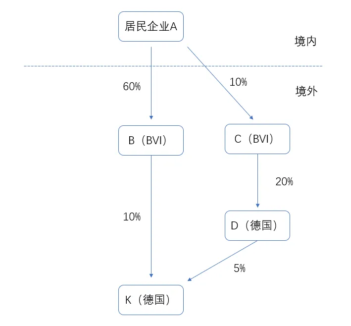 如果外国企业既被报告人直接持有,也被报告人通过多个链条间接持有,则以其直接持股层级填列。如示例4中的K公司既被A公司直接持有,也被A公司通过B公司、C公司和D公司间接持有,那么以其直接持股层级填列,所在层级填“1”。