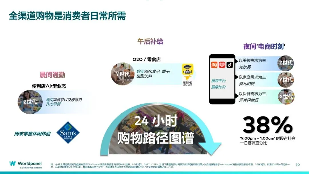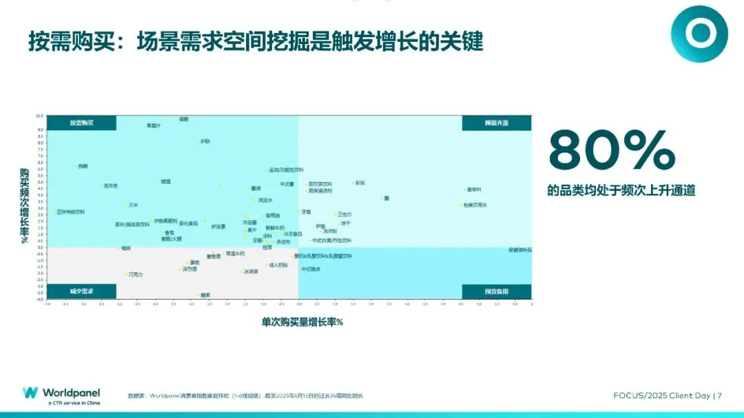 中国快消品市场进入从量到质的新阶段,媒体、渠道和品牌选择碎片化带来挑战与机遇。消费者在多渠道、多品牌、多触点环境下,购买行为更复杂。但报告发现,消费者需求依然坚挺,如纸品市场规模三年增长2.4倍,增量来自新兴细分纸类。按需购买重要性凸显,挖掘场景需求是增长关键,如下午茶和早餐后午餐前时段,饼干、膨化零食、坚果瓜子等品类购买频次上升。