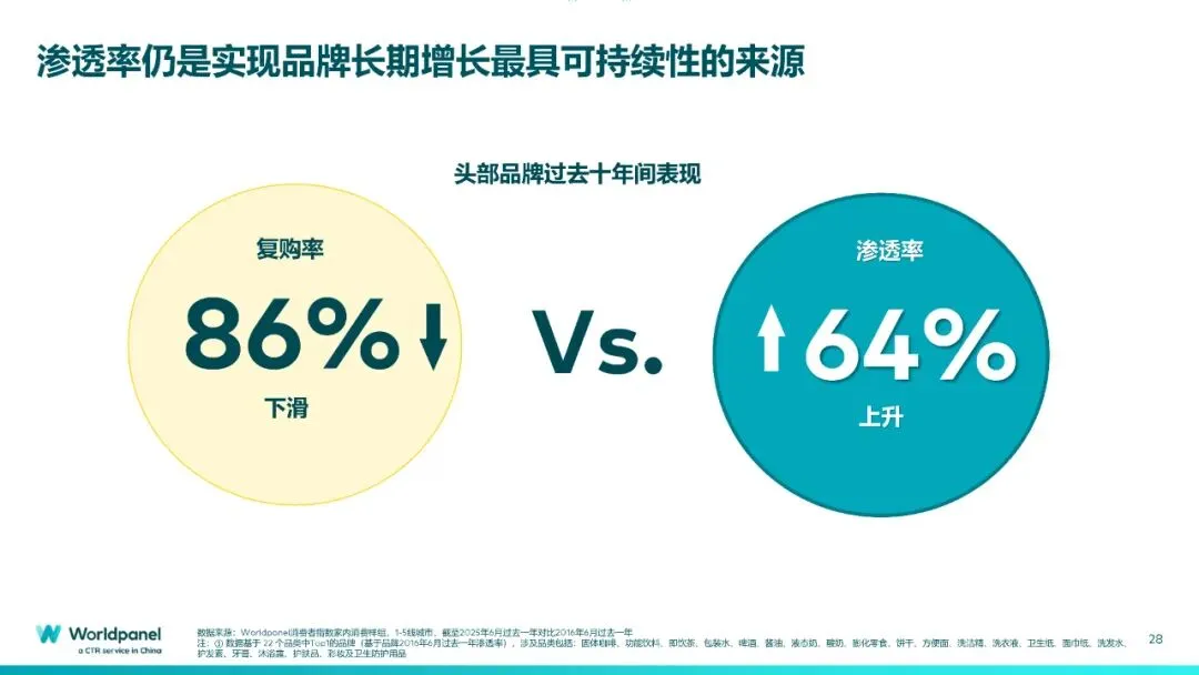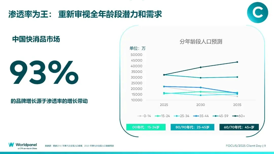 渗透率是品牌增长的核心驱动力。报告分析不同年龄段人口预测,揭示不同世代消费特点。如60/70年代的“熟龄力量”和80/90年代的“担当力量”各有消费特点,品牌商需洞察需求,为细分人群打造合适产品和服务。报告还探讨品牌通过极致产品体验、情感叙事等方式与消费者建立情感共鸣,如霸王茶姬“微光计划”提升社会价值。同时,强调消费者触及数(CRP)重要性,品牌需在关键时刻赢得消费者决策点。